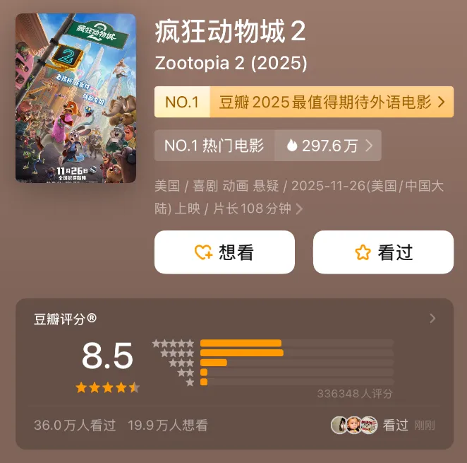 目前,《疯狂动物城2》在豆瓣上的评分虽不及前作的9.3分,但也达到了8.5分。对于续作,网友们对此褒贬不一,有网友认为:超棒!强者自己创造档期。