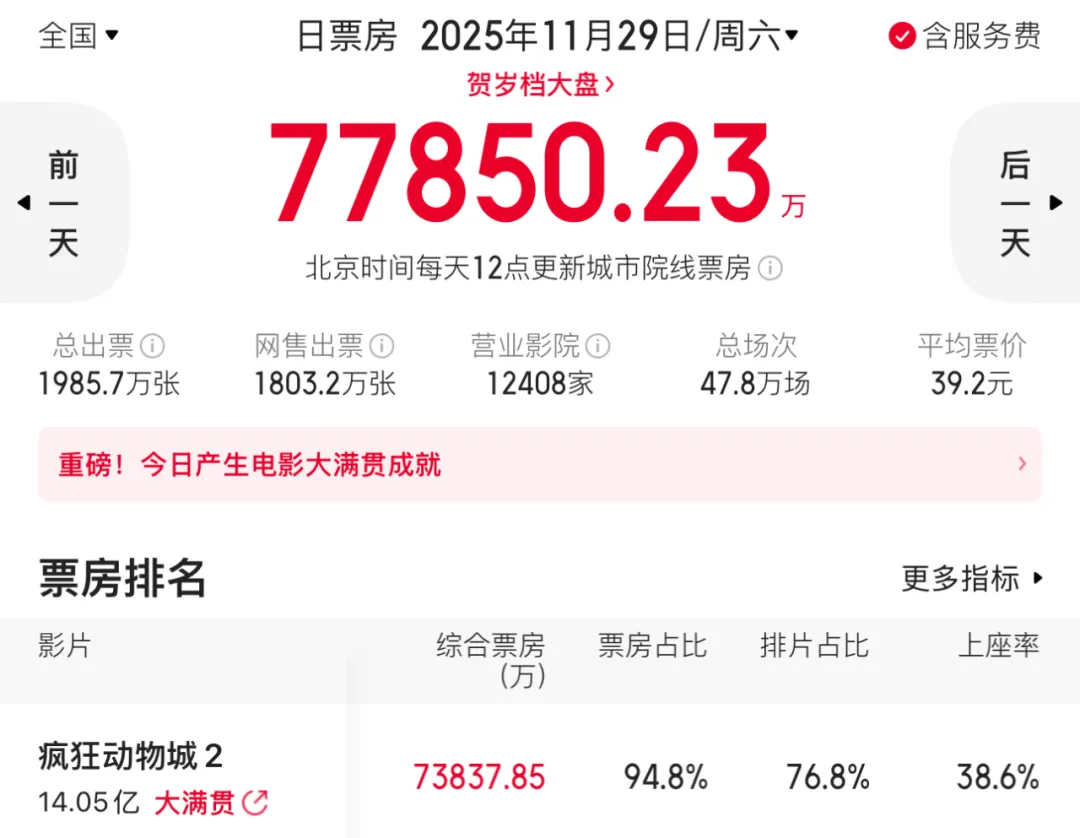 在《疯狂动物城2》电影火爆之际,其院线的排片率也在不断攀升,截至11月30日,《疯狂动物城2》的院线排片率已达83.3%,同时《疯狂动物城2》也为当日大盘票房贡献了近95%的票房收入,展现了极大的吸金能力。